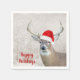 Big buck deer in snowflakes with Santa Claus hat in winter woods.