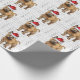 This adorable Cairn Terrier dog is dressed for the holiday season in a Santa hat, sitting against a soft woof word art background, perfect for wrapping gifts for the dog moms and Cairn dog lovers.