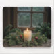 A lit candle sits on a wooden ledge by a snowy window surrounded by Christmas pine branches and red berries