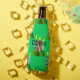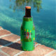 This bottle cooler has a Christmas design of candles made of rectangles decorated with stars, ovals, or diamonds with trees grouped around the bottom.