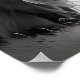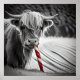 In this captivating black and white portrait, a charming Highland cow is depicted in a delightful holiday scene. The Highland cow is shown with its long, shaggy coat and iconic set of curved horns. It gazes intently in a distance with a Christmas red and white candy cane, which it is seen chewing on with apparent curiosity and enjoyment.