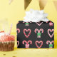 This cute wrapping paper is versatile and can be used for giving gifts or art and craft projects. The design features festive striped candy canes on a black background.