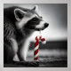 In this engaging black and white portrait, a resourceful racoon is depicted in a candid moment, chewing on a broken piece of a Christmas red and white candy cane. The scene captures the racoon's innate curiosity and adaptability, traits that are often associated with this clever creature.