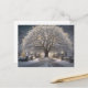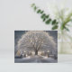 Snow-kissed tree and road under a dusky sky. Falling snowflakes weave a tranquil winter evening. Ideal for Christmas cards. Embrace the season's magic with this enchanting scene.