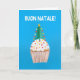 A bright and cheerful Italian Christmas Card with a decorated Christmas Tree on top of an iced cupcake, from a handpainted paper collage by Judy Adamson. The front greeting, in white text on a blue background, is 'Buon Natale!' and the inside message, which you can change, is, '...e Felice Anno Nuovo!'.