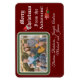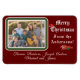 Christmas Card Photo Magnet design features your photo in top left corner against a burgundy background. Photo is framed by a lovely green and white border. Customisable heading reads, "Merry Christmas" in white lettering. Image of a Santa hat is balanced on top of the "C". Wording just below reads, "From the (Family Name). An image of Christmas gifts is pictured below. Giving the design a personal touch, the "Signatures" of the family members are displayed below in a lovely, cursive font.