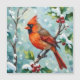 A charming scene of a single red cardinal perched gracefully on a snow-dusted holly branch, its crimson feathers a vivid pop of colour against the cool greens and whites. The rich watercolor palette focuses on jewel tones—emerald and ruby —with gentle washes creating a soft, ethereal background of blurred winter foliage. The brushstrokes are fine and detailed for the bird, becoming softer and more impressionistic for the setting, conveying quiet beauty and peace.