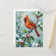 A charming scene of a single red cardinal perched gracefully on a snow-dusted holly branch, its crimson feathers a vivid pop of colour against the cool greens and whites. The rich watercolor palette focuses on jewel tones—emerald and ruby —with gentle washes creating a soft, ethereal background of blurred winter foliage. The brushstrokes are fine and detailed for the bird, becoming softer and more impressionistic for the setting, conveying quiet beauty and peace.