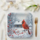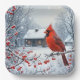 A red cardinal perches on a snow-covered branch adorned with bright red berries and a rustic cosy cabin in the background
