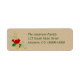 A Christmas return address label featuring a stylised red cardinal sitting on a sprig of holly with pine branches and golden swirls on the left margin set on a parchment looking background.