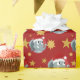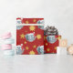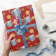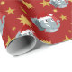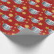 Christmas wrapping paper with an illustration of a cute elephant with red Santa cap; great decoration for Christmas holidays, with a red background with stars, illustrated by Radka Kavalcova