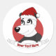 Round stickers with illustration of a head of cute panda bear with Santa's hat; great decoration for Christmas holidays, editable template design with custom field for your own text, illustrated by Radka Kavalcova