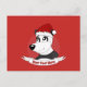 Postcard with illustration of a head of cute panda bear with Santa's hat; great decoration for Christmas holidays, in red circle,, editable template design with custom field for your own text, illustrated by Radka Kavalcova