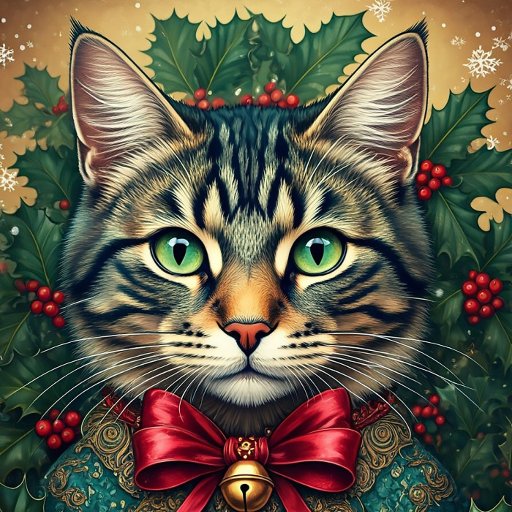 He's the coolest of cats, decked out in his Christmas finery including a golden jingle bell on a red neck ribbon. Surrounded by bright green holly, he'll be the perfect kitchen helper this holiday season, holding lists and recipes on the fridge. Send him to a friend in a greeting card, or just tuck him into the family cook's Christmas stocking?