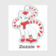 Christmas cat sticker with a cute and beautiful white cartoon kitty with long eyelashes wearing a red hat, scarf, gloves and boots, its curled tail decorated with red ribbon. Snow is falling in the forest and the moon is cheerfully glowing. This pretty feline character is in a holiday mood, waiting for Christmas Eve to come.