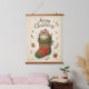 A festive illustration features a cute tabby cat wearing a Santa hat, nestled inside a green and red Christmas stocking. The stocking is decorated with traditional patterns. Above the cat, the words "Merry Christmas" are written in a decorative script. The background is a soft beige color, adorned with stars, dots, and sprigs of greenery.