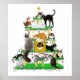 Original fine art design of cats having fun on a cat tree decorated for Christmas by designer Carolyn McFann of Two Purring Cats Studio on quality fine art holiday posters for cat lovers.