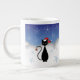 Cute goth style cat in a red christmas santa hat and a christmas bauble on the end of its tail with snowflakes.