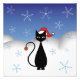 Cute goth style cat in a red christmas santa hat and a christmas bauble on the end of its tail with snowflakes.