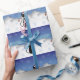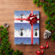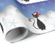 Cute goth style cat in a red christmas santa hat and a christmas bauble on the end of its tail with snowflakes.
