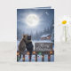 Two cats cuddle on a snowy fence decorated with festive lights, as a bright full moon illuminates the winter night and cozy cabins stand in the background