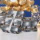 Two cats cuddle on a snowy fence decorated with festive lights, as a bright full moon illuminates the winter night and cozy cabins stand in the background