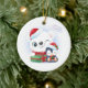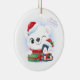 This ceramic Christmas Ornament is shown in a round shape with a white background and a festive holiday polar bear and penguin print.
