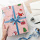 Christmas Character on Pink and Gold Glitter Wrapping Paper. Patterns include Santa Claus, snowman, polar bear, Christmas tree, gingerbread, reindeer, gift box, stocking and candy cane.