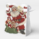 Tent-style with white ribbon favour box with a vintage 1940s image, on the front and back, of jolly Saint Nick with a bag full of toys and carrying a box of Christmas cheer in snowfall. See the entire Holiday Favour Box collection in the PARTY FAVORS section.