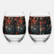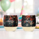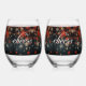 Stemless wine glasses with an cheers in a silver effect. Beautiful red , gold and white snowflakes on black. Add any text you like.
