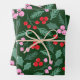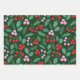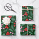 The wrapping paper is a festive amalgamation of classic Christmas symbols and colours. On a deep green background, a repeating pattern showcases delicately interwoven strands of golden tinsel and holly leaves with their bright red berries. Interspersed between these are small, intricately detailed snowflakes, each unique in design, shimmering with a subtle silver foil effect. Generously scattered across this seasonal tapestry are miniature illustrations of Santa's sleigh, reindeer in mid-flight, and cosy little cottages with smoke rising from their chimneys, suggesting the warmth of a fireplace within. The overall look captures the essence of Christmas, inviting the anticipation of unwrapping and the joy of the holiday season.