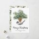 This personalised winter themed Christmas card features a cute chickadee perched upside down on a pinecone hanging from a pine sprig.
