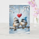 Two chickadee birds wearing cosy hats perch on snow-covered branches with a red heart hanging above them and surrounded by a winter landscape.