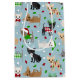Cute Christmas Chihuahua dogs with black, tan, cream, blue and grey coats dressed in festive holiday outfits, Santa hats and argyle sweaters with scattered Christmas ornaments pattern.