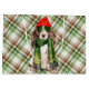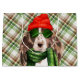 Adorable holiday greeting for the dog lover who has a fondness of the Cocker Spaniel dog breed with a brown Spaniel in green sunglasses, a red winter cap and green scarf on a seasonal plaid patterned background.