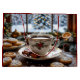 Beautiful unique Christmas gift bag with a festive illustration of a fancy vintage coffee cup of warm coffee next to a plate of sugar cookies and cinnamon sticks.