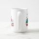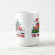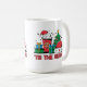 A vibrant illustration features a coffee cup adorned with holiday sayings, alongside a decorated Christmas tree and wrapped gifts. The cheerful scene captures the spirit of the season, inviting warmth and joy during winter festivities.