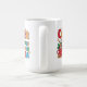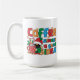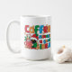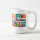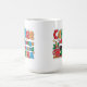 A colourful coffee cup adorned with cheerful Christmas sayings and holiday decorations.