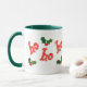 A white ringer mug with hunter green rim and handle with 'ho ho ho' in red and gold letters and holly, from a handpainted paper collage design by Judy Adamson. This design is also available as a Christmas card and on gifts and apparel.
