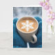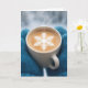 A steaming cup of coffee, decorated with a snowflake design in the froth, held in blue knitted mittens against a snowy backdrop.