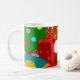 This mug has a Christmas design of a collage of a Christmas tree, an ornament, a stocking, a gift, and a gingerbread boy.