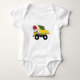 A cute illustration of a Christmas construction truck vehicle wearing a Santa hat and decorated in Christmas lights transporting a festive Christmas tree. Perfect for boys and girls who love construction trucks, toy trucks or heavy machinery. An ideal Christmas baby bodysuit for truck enthusiasts big or small, girls or boys.