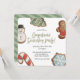 This watercolor/gouache style invitation showcases Christmas gingerbread cookies decorated with icing. This invitation features a gingerbread man with red overalls and green buttons, a Christmas tree with pink, white, and red ornaments, a snowman with a black top hat, buttons, a carrot nose, and a blue neck tie, a candy cane with red, green, and white stripes, and a snowflake cookie with blue and white icing. The back of the card features a watercolor stripe design. The typography is a green script title and vintage inspired font for the party details.