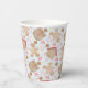 This adorable Christmas paper cup features a blue and white striped background with gingerbread boy, girl, and house cookies, as well as chocolate chip cookies, star sugar cookies, peppermint candies, and candy canes.