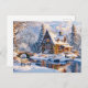 Festive illustration of a cosy cottage by a snowy riverbank, adorned with Christmas decorations and surrounded by a peaceful winter landscape.