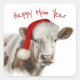 Cute Hereford cow with a red and white Santa Claus hat on white background.