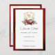 Timeless and elegant yet festive holiday-themed wedding save the date design featuring classic hand-drawn gold floral crest accented by a colourful spray of red and white Christmas flowers and evergreens. This custom formal template includes editable text fields as well as custom calligraphy text graphics and a gold textured border. Back features additional text fields and complementary Christmas floral graphic.