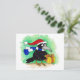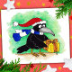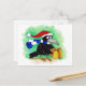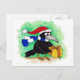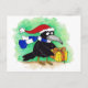 A Christmas postcard featuring a crow with a Santa Claus hat and holding a present.