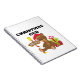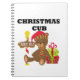 An adorable Christmas holiday design features a brown bear in a holiday stocking cap, wrapped gifts of red and green, and a sign for the North Pole!