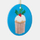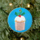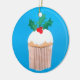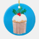 A Christmas Ornament with a cupcake on each side. The white frosting is topped with a sprig of holly and its red berries and is from a handpainted paper collage design by Judy Adamson. Coffee mugs and Christmas cards with this design also available.